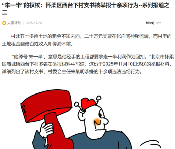 - “朱一半”的权杖:怀柔区西台下村支书被举报十余项行为--系列报道之二 2025-11-26 点击:22 评论:0